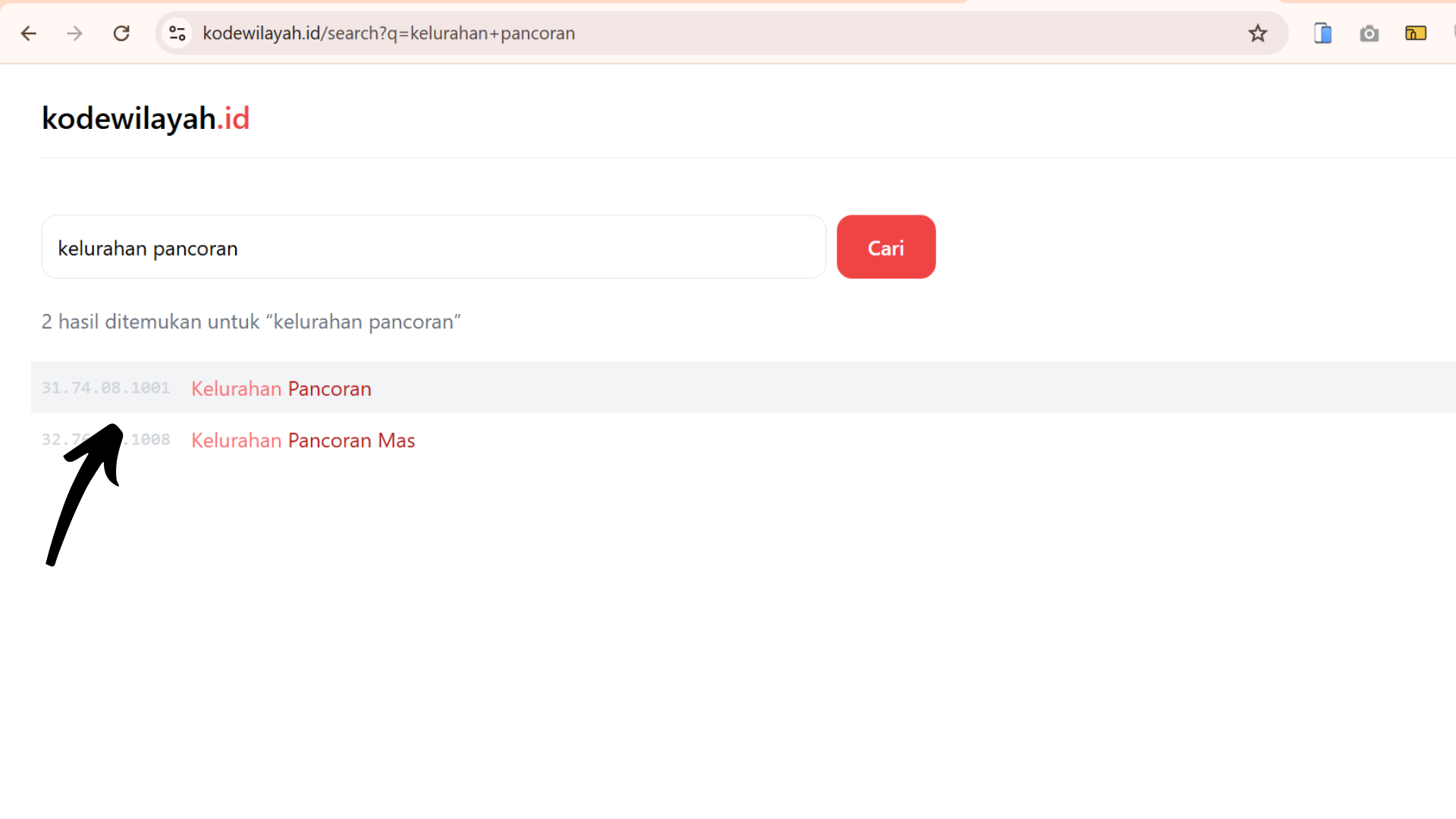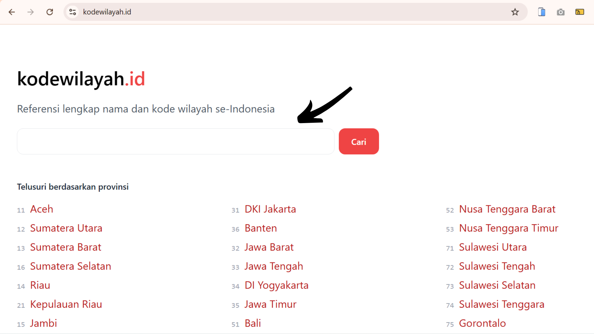 Masuk ke website Kode Wilayah lalu ketikkan nama kecamatan atau desa Anda pada kolom pencarian yang tersedia.