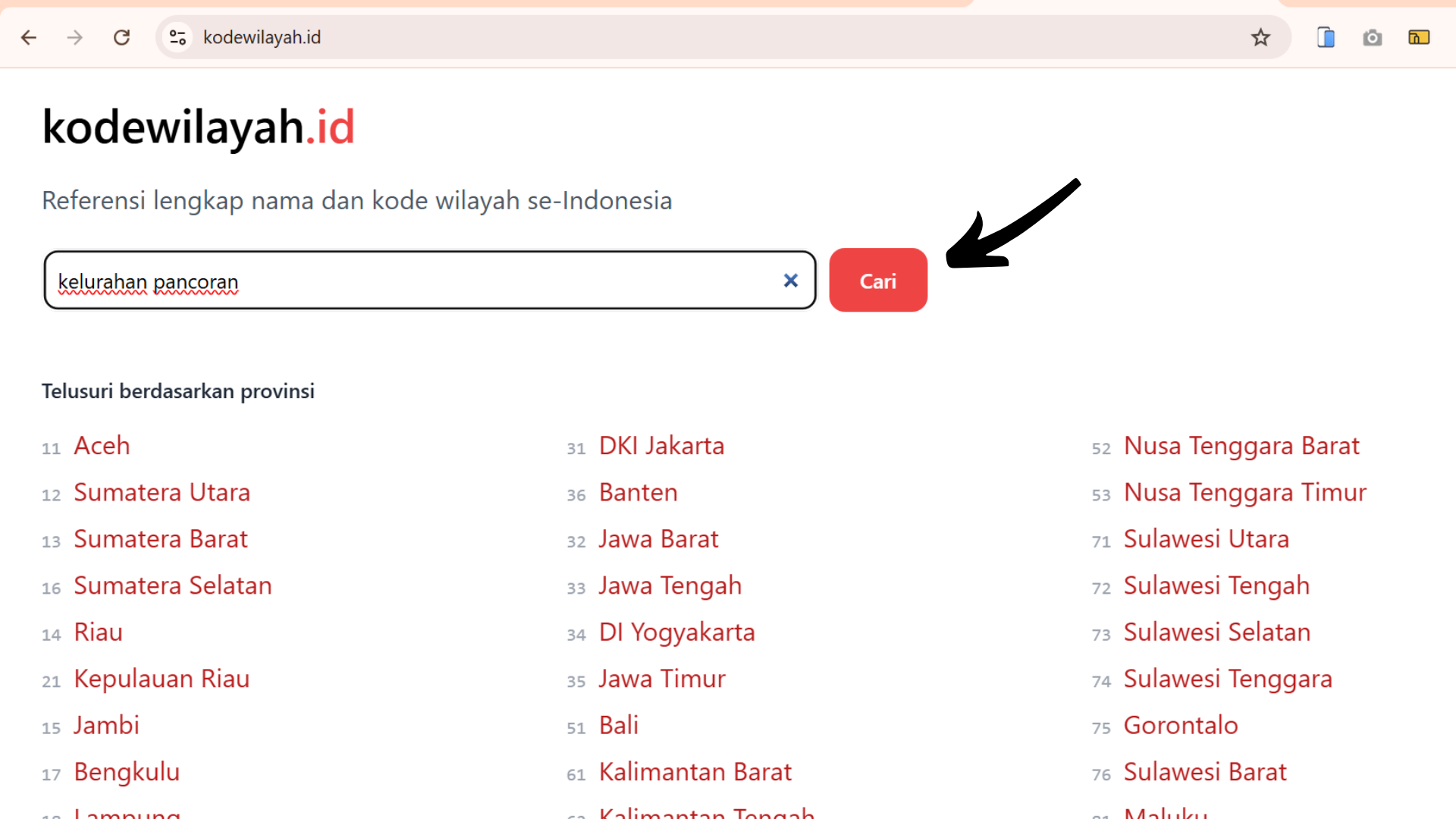 Setelah dimasukan nama kecamatan atau desanya, lalu anda bisa menekan tombol cari yang berada di sebelah kanan dari si search bar nya.